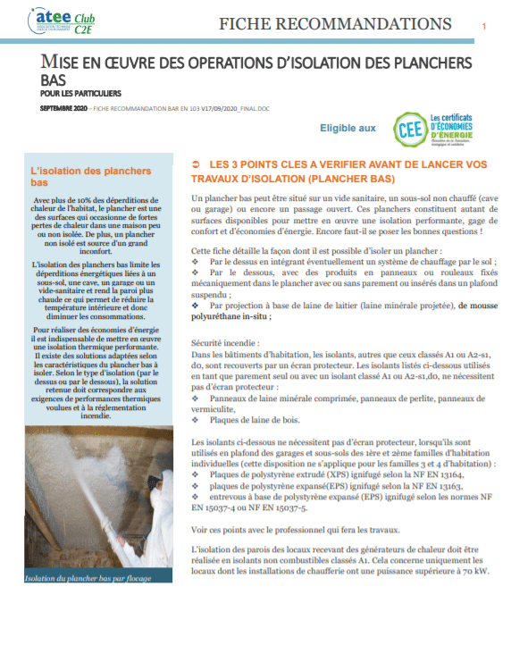 Cette fiche s’adresse aux particuliers et aux poseurs soucieux de respecter les bonnes pratiques, notamment dans le cadre des opérations CEE (Certificats d’Économies d’Énergie) couverts par la fiche d’opération standardisée BAR-EN-103. Elle reprend les règles de l’art et prodigue des conseils pour réussir ses travaux d’isolation des planchers bas. Que ce soit par projection en sous-face comme par la fixation d’isolants en panneaux.