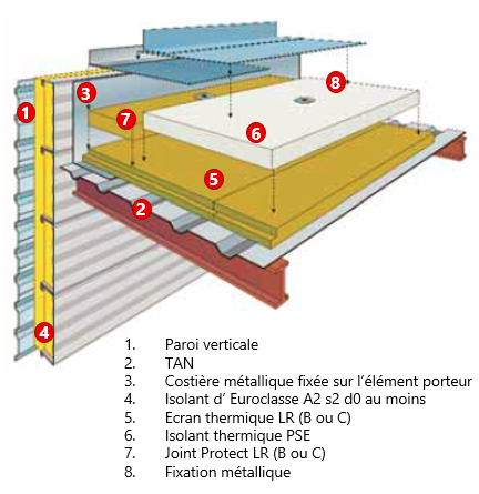 - Soit le plancher bas du dernier niveau est situé à plus de 8 m du sol et un écran thermique doit être ajouté. Soit le système Stisolétanch® Protect (Stisolétanch® BBA + 60 mm de laine de roche Protect LR B ou C pour un élément porteur en TAN ou 40 mm pour un élément porteur en bois)