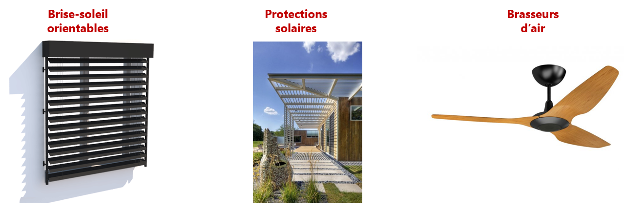 En lieu et place de la climatisation (qui pénalise fortement le Cep et l’impact carbone Ic composants), des solutions passives ou actives pourront être prescrites pour permettre d’atteindre les seuils de DH. Ces solutions ont l’avantage d’être plus économiques, plus économes en énergie et moins impactantes au niveau carbone.