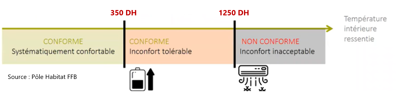 La RE2020 définit deux seuils : un seuil de 350 DH sous lequel le projet est conforme et le bâtiment confortable ; un seuil de 1250 DH au-dessus duquel le projet n’est plus conforme, le bâtiment présentant un inconfort inacceptable.